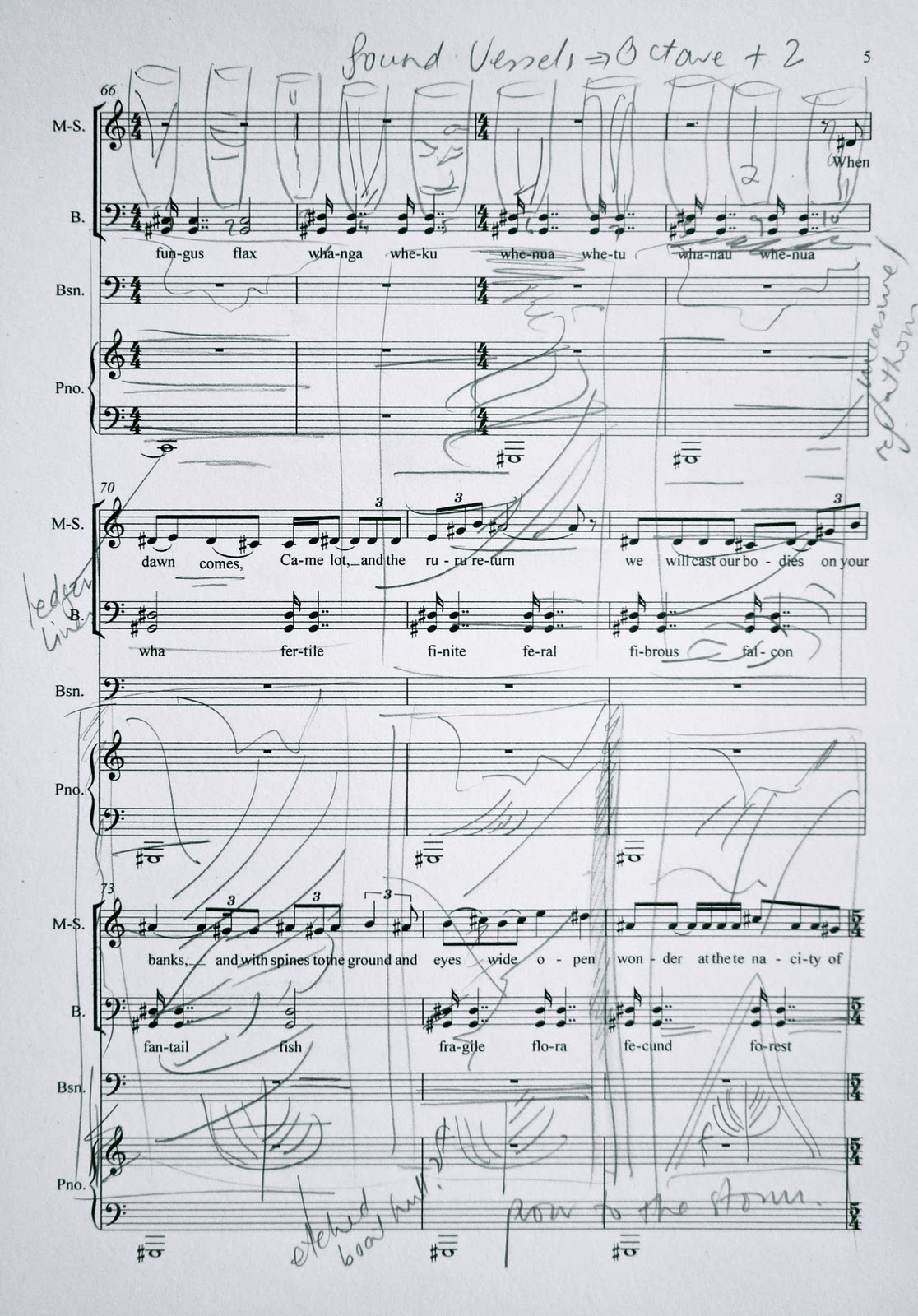 ** In the Maori language, the letters Wh sound as an F does in English; the chorus in this piece called on Wh- and F- sounds for their cultural, linguistic and percussive effect (amongst many others, the bass chorus featured the words fecund forest fragile fauna falter fathom fall whanga wheku whanau whenua whetu. . . The intention was to evoke a sense of ancestral voices.)