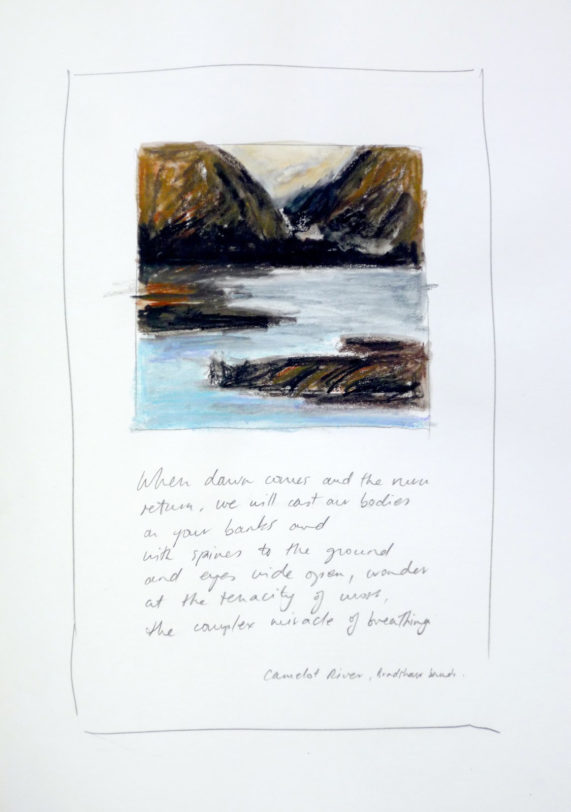 These fragments come from a longer text written in response to Camelot River, an ancient black waterway in Western Fiordland, one of New Zealand's most magnificent and inaccessible areas of primordial forest and uninhabited coastline. The Sounds are referred to by many as the 'birthplace of waterfalls'. I lost - and found - my heart there during a creative residency in 2008. One of the artists on board the conservation yacht was composer Gillian Whitehead. We returned to Dunedin much affected by our experience; our F-/Wh- Fugue is one of several collaborative projects that came out of that time.